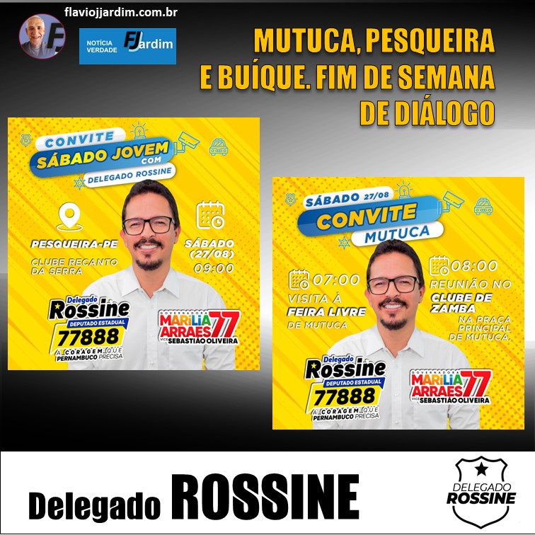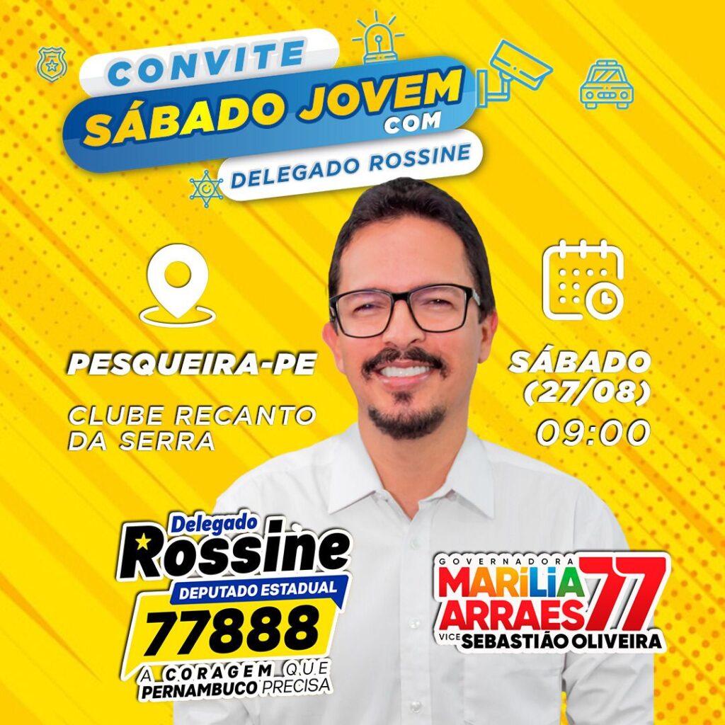 Em Pesqueira, após às 9h, haverá o Sábado Jovem com o Delegado Rossine, no Clube Recanto da Serra. O Delegado Rossine vai conversar com os jovens e falar sobre as propostas que trazem benefícios para a juventude.