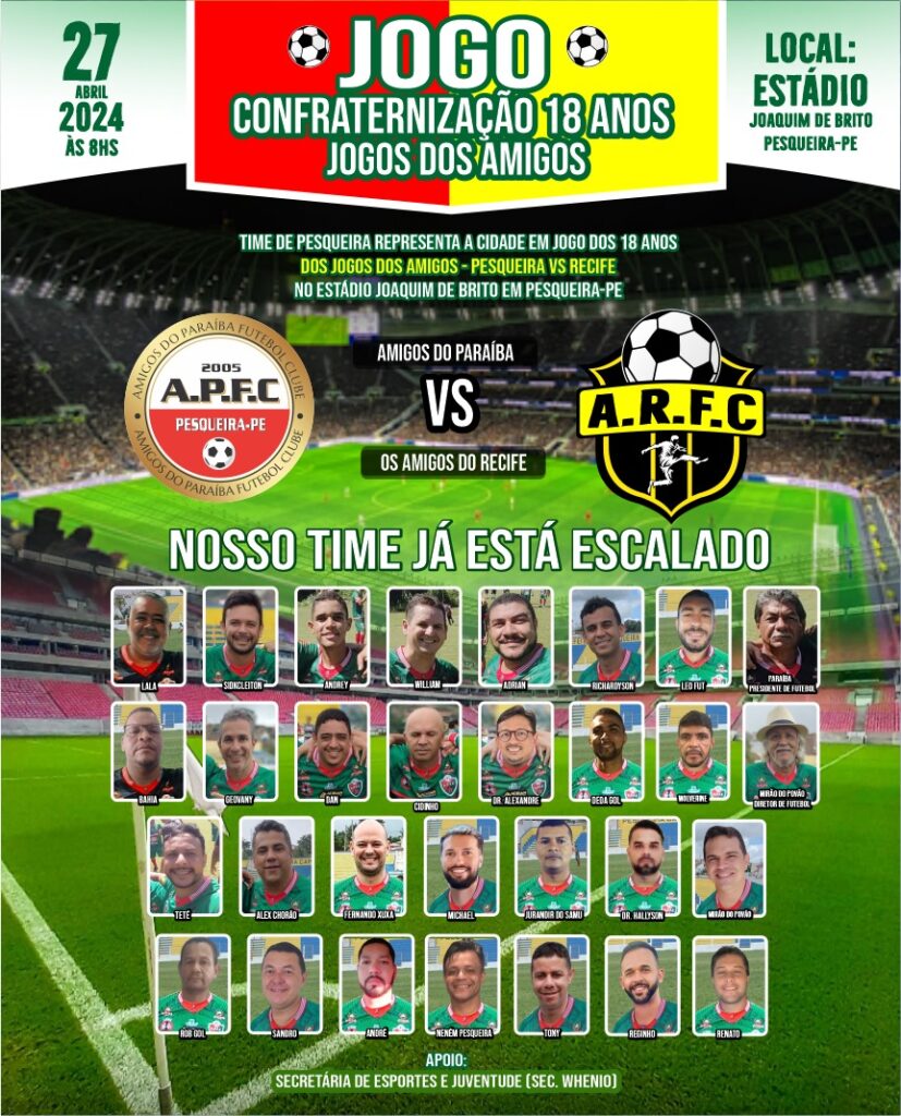 PESQUEIRA (PE) - É com imensa alegria que anunciamos o tão aguardado Jogo Confraternização 18 anos entre os Amigos do Paraíba e os Amigos de Recife. Há quase duas décadas, esse emocionante confronto tem sido o ponto culminante de nossas celebrações, marcando encontros memoráveis e momentos de pura diversão.
