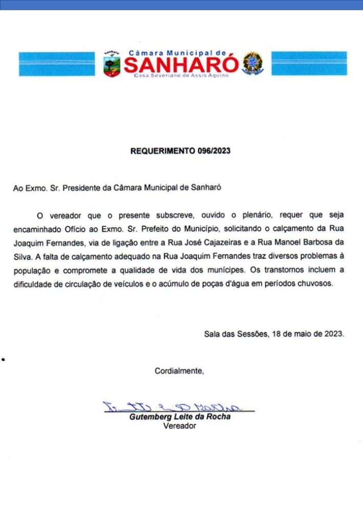 SANHARÓ (PE) – O vereador Gutemberg Leite da Rocha, Guto do Salgado, ficou eufórico com a aprovação do seu Requerimento, com a associação do plenário da Câmara de Vereadores de Sanharó, que solicita a construção do calçamento da Rua Joaquim Fernandes.