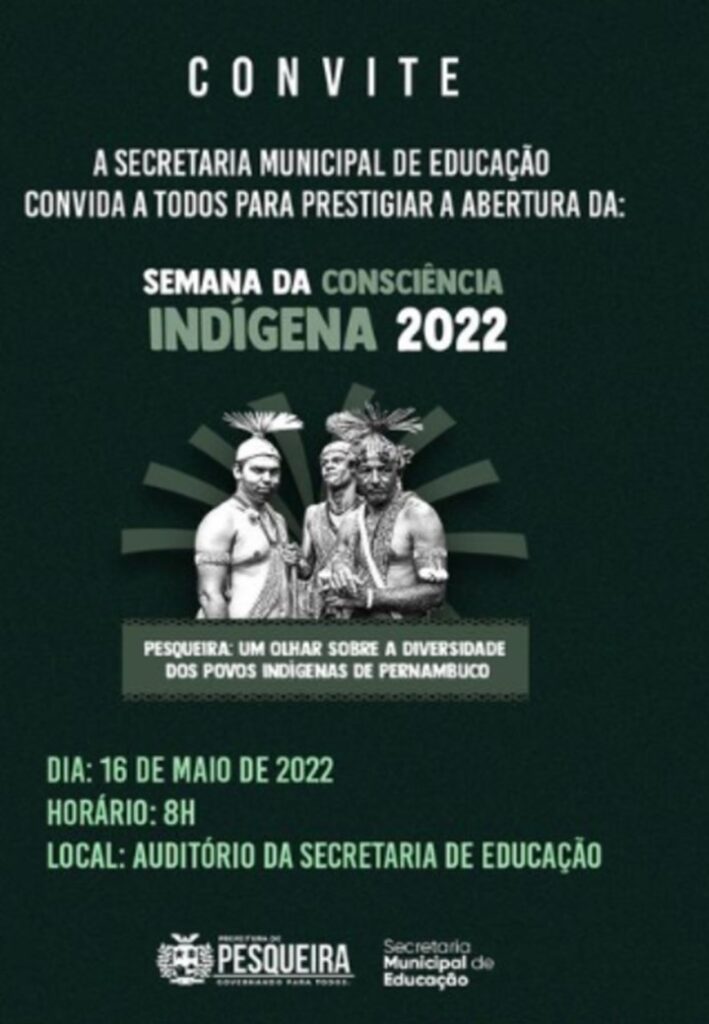 Segundo o secretário de Educação da Prefeitura de Pesqueira, Thiago Torres, a culminância da Semana de Consciência Indígena será no dia 16 de maio de 2022, a partir das 9h, no auditório da Secretaria de Educação, “onde irão acontecer debates com diversas lideranças tais como: Elisa Pankararú, Neguinho Truká e Vasco Sarapó”.